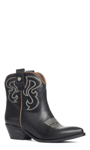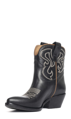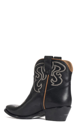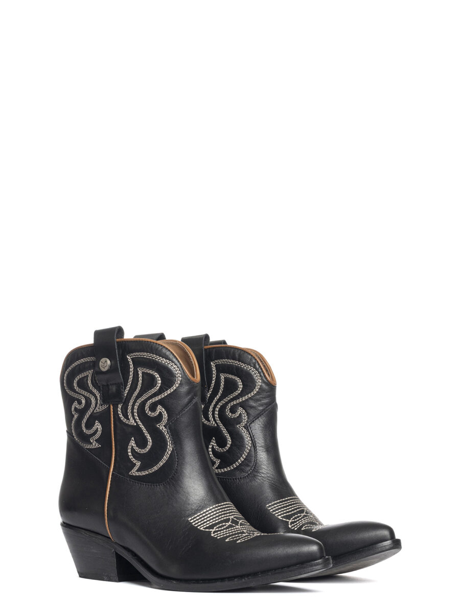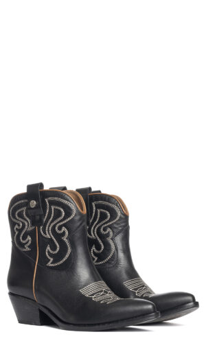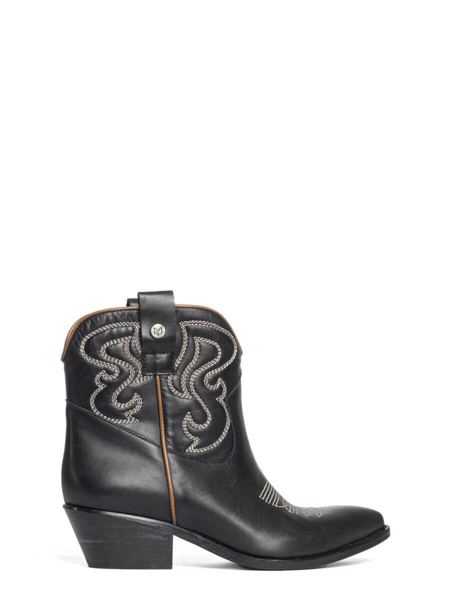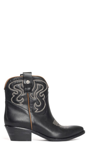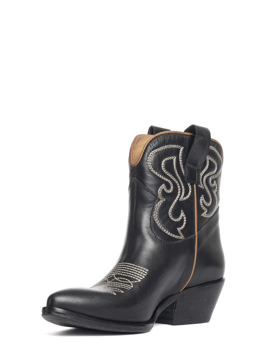 Stivaletti texani in vitello nero con profilo cuoio e decori.