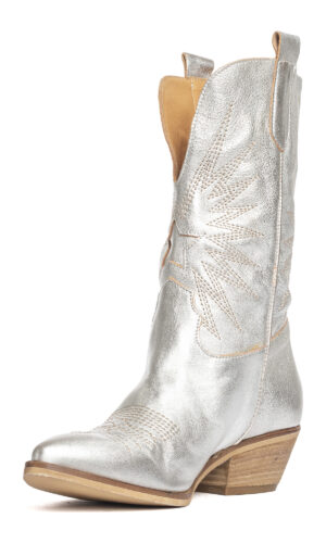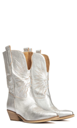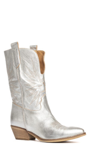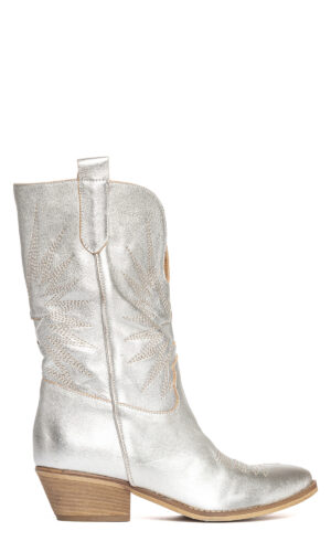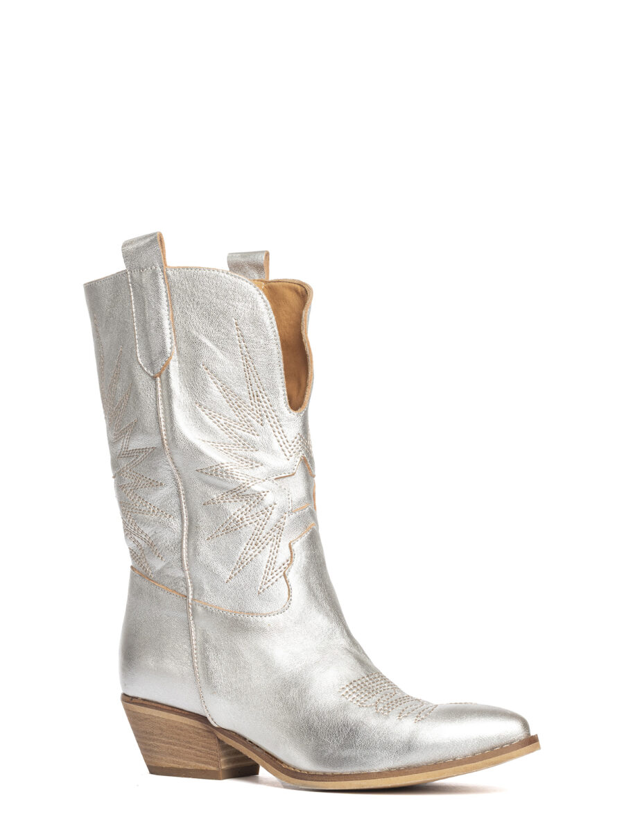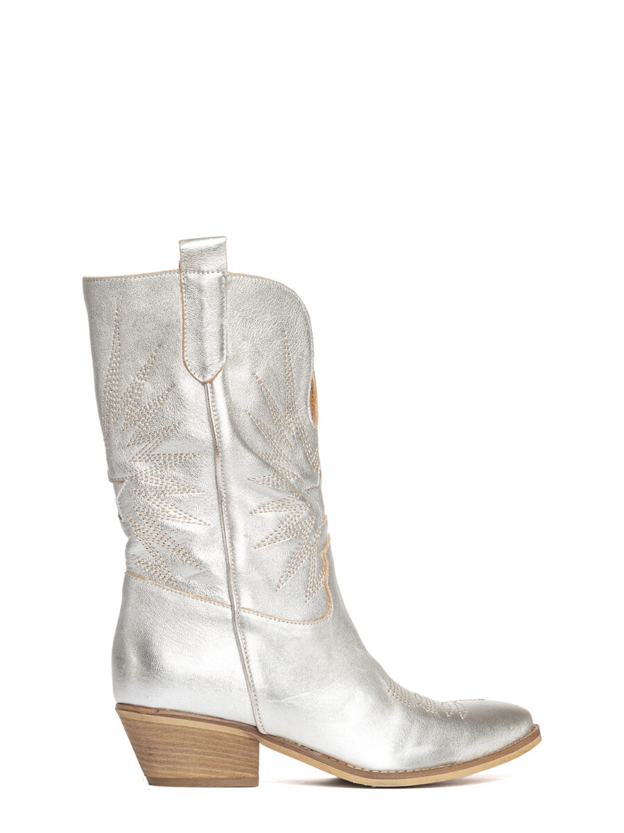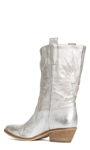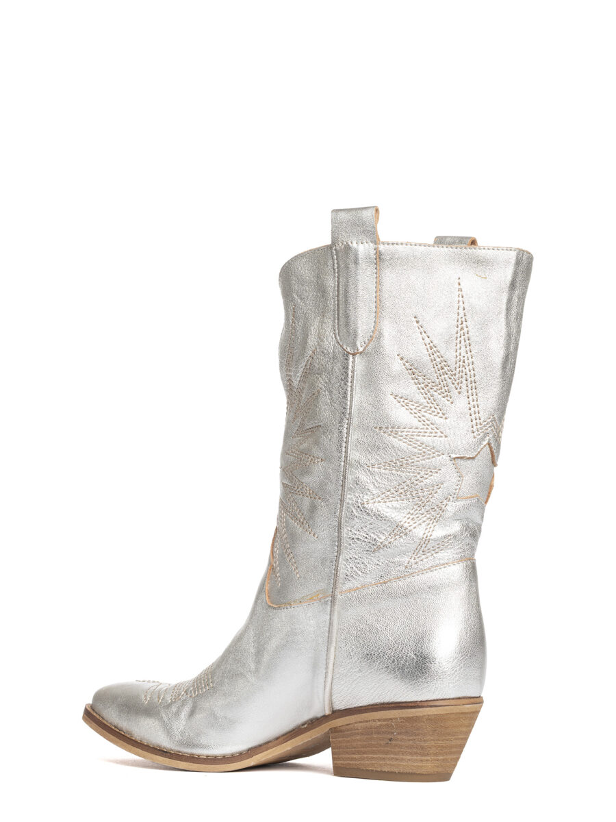 Stivali texani in laminato argento con decori.