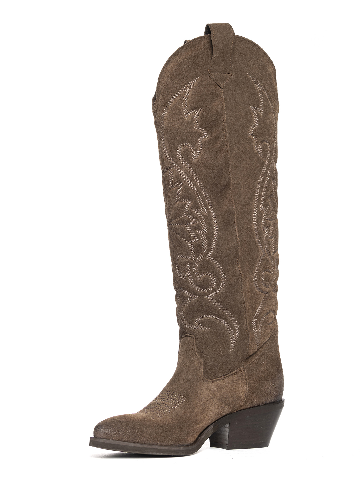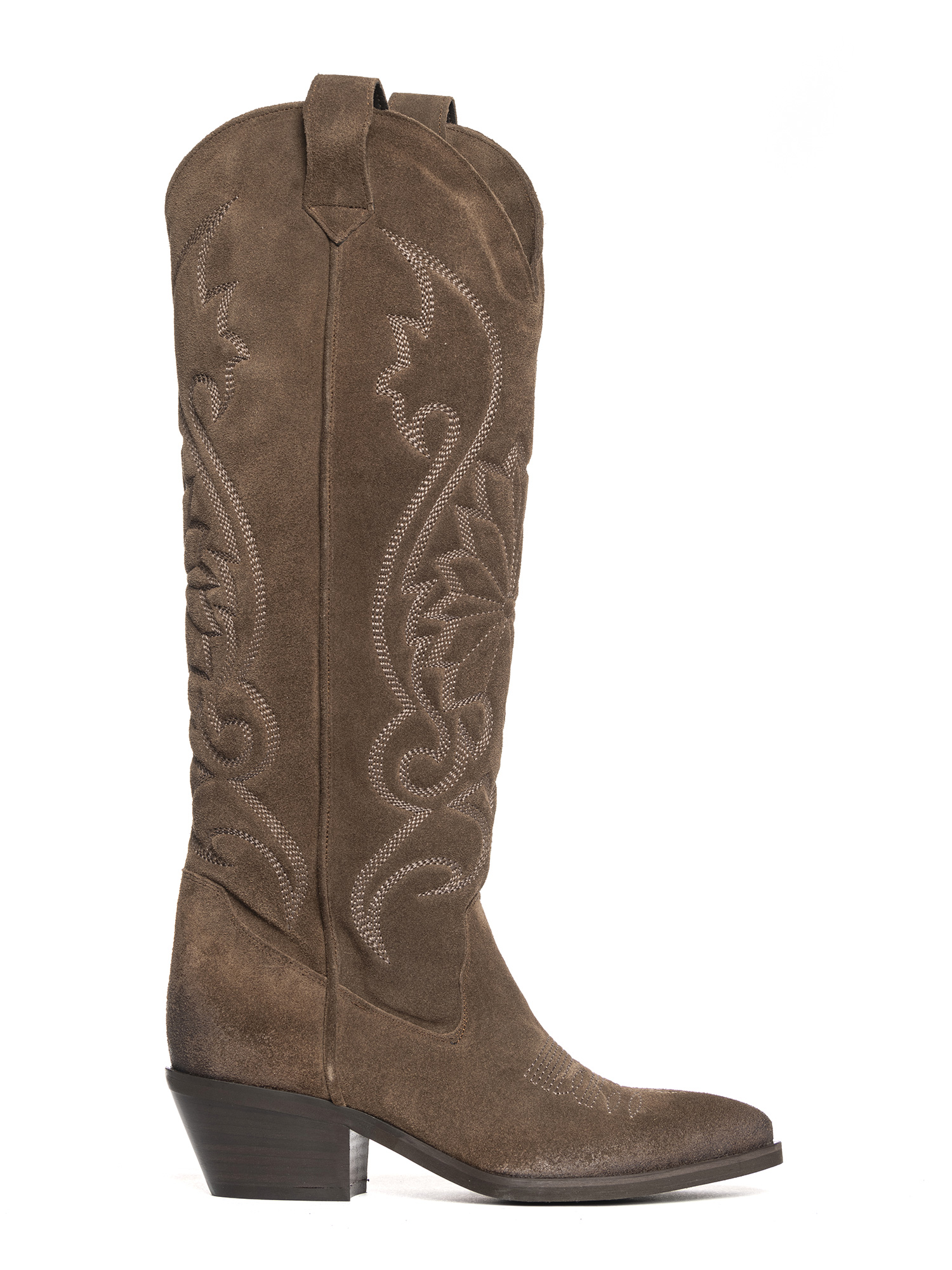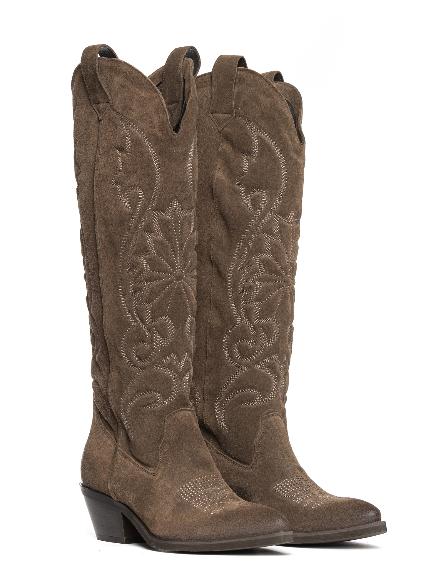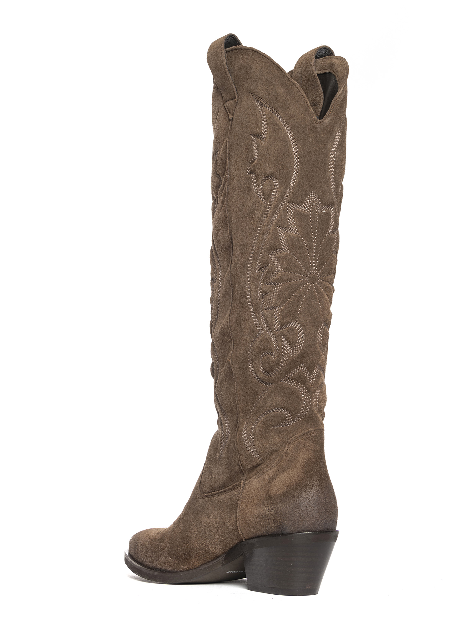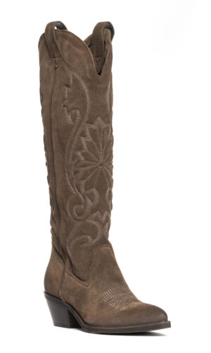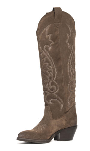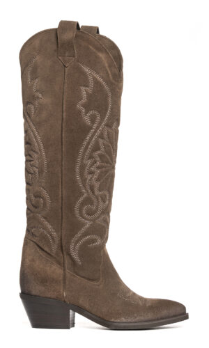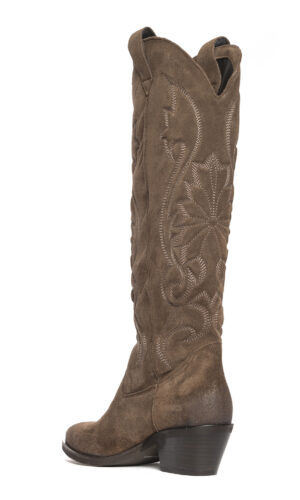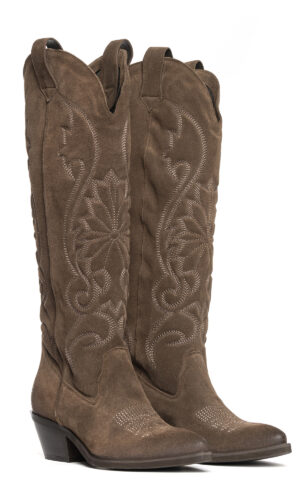 Stivali texani in camoscio fango con ricami.