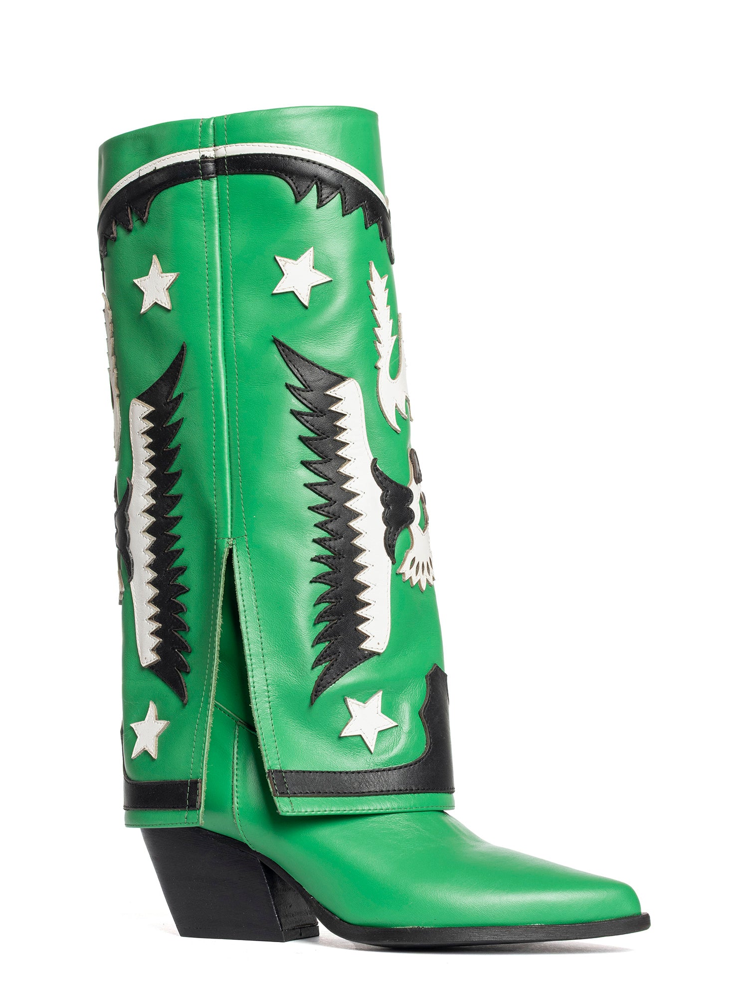 Stivali texani in vitello verde. Codice: Avana Modello: stivali texani Materiale: vitello Colore: verde Chiusura: tubo Altezza gambale: 36 cm Circonferenza gambale: 33 cm Altezza tacco: 8 cm