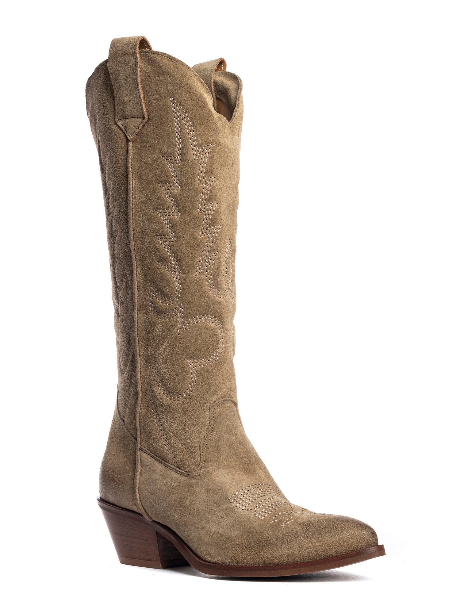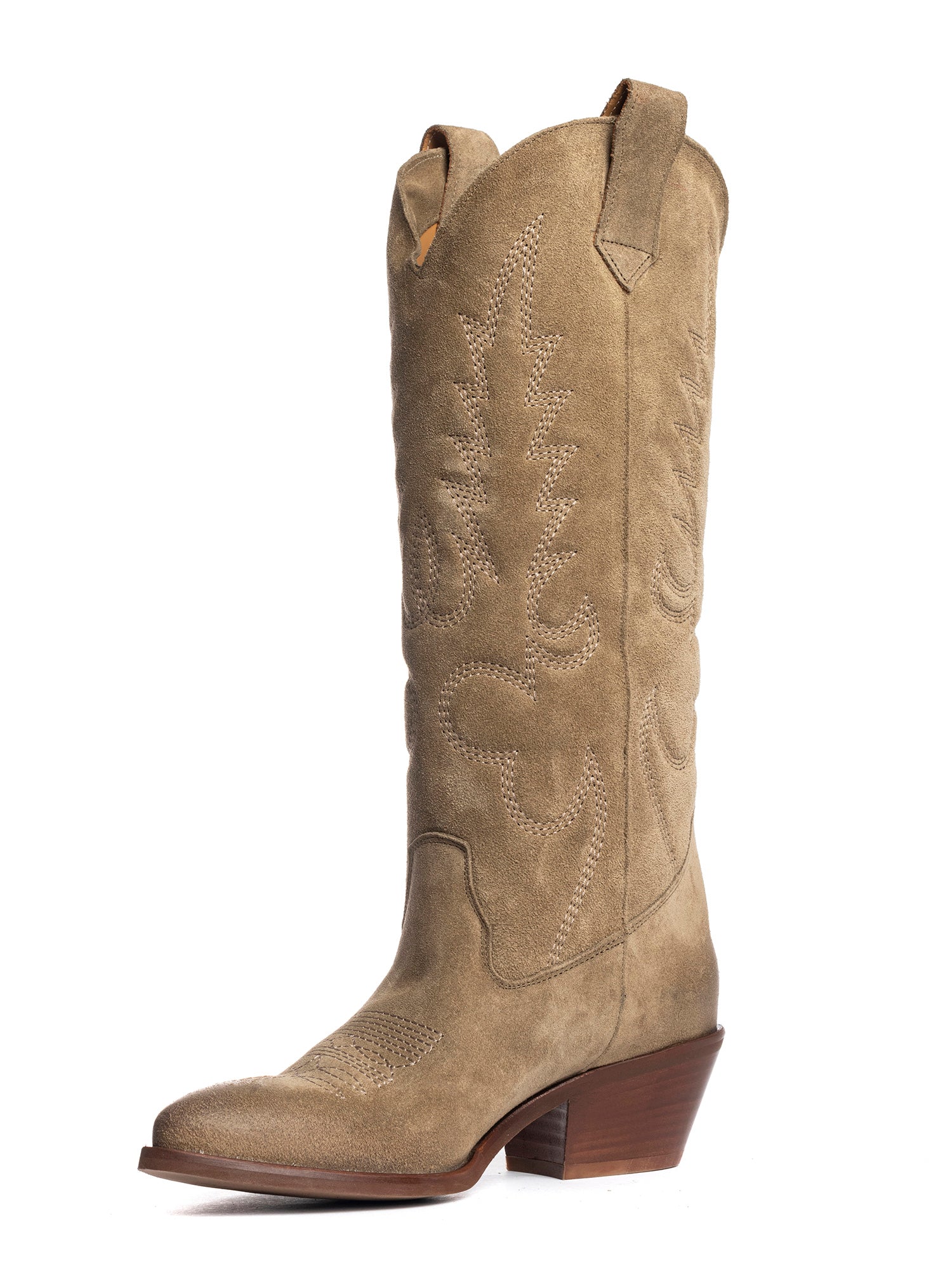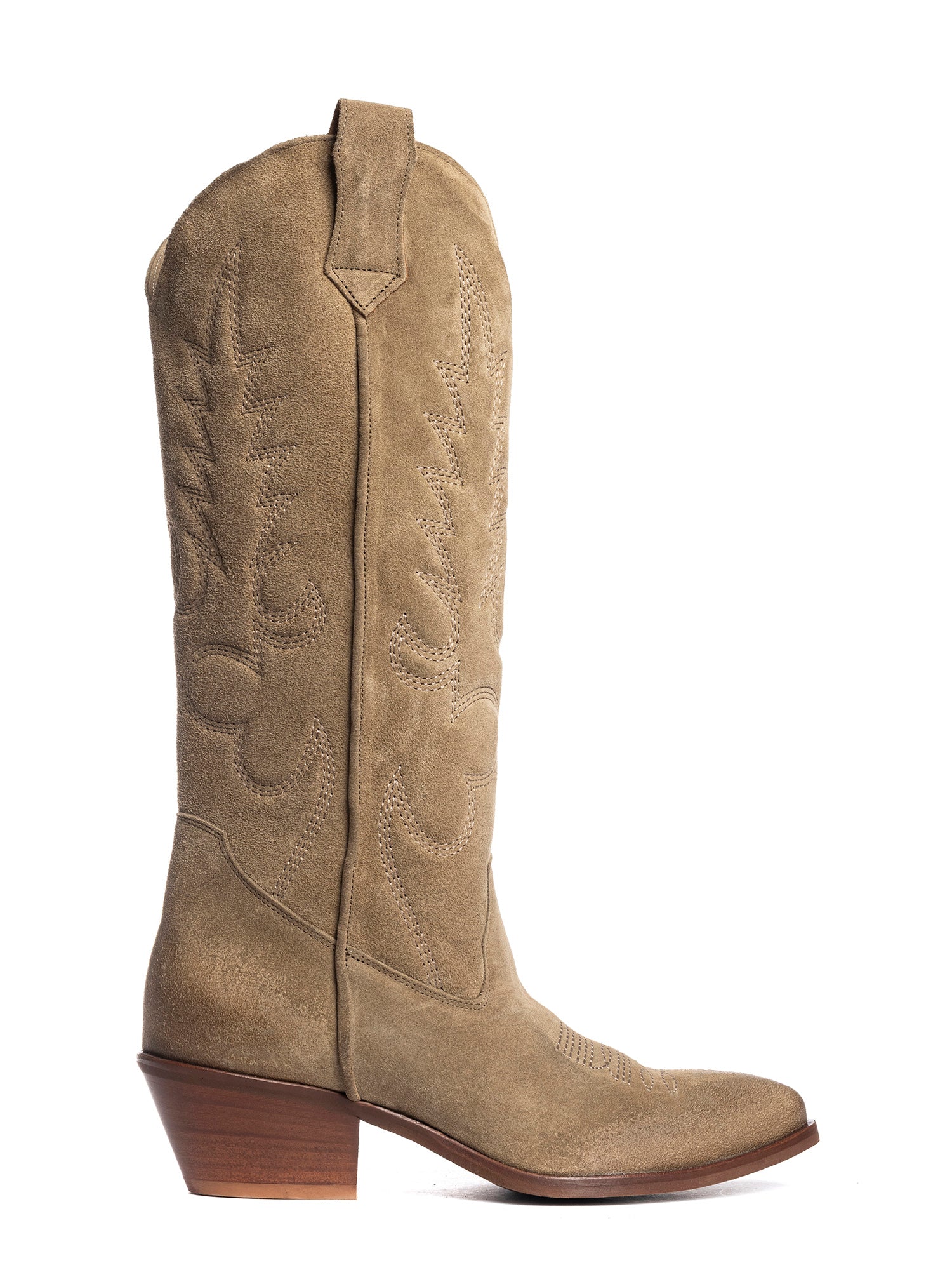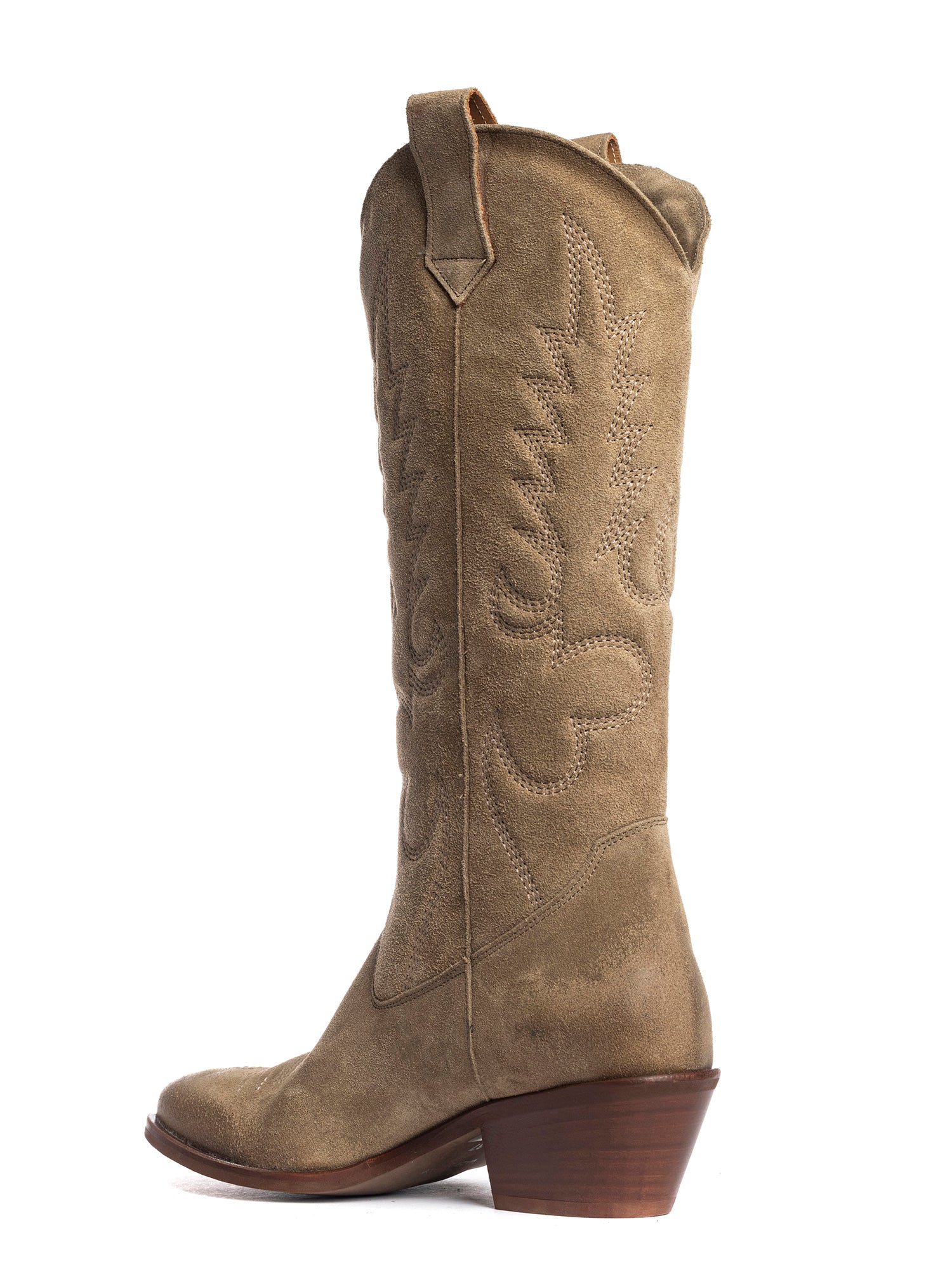 Stivali texani in camoscio visone con decori Codice: California Categoria: texani Materiale: camoscio Colore: visone Suola: gomma Chiusura: tubo Altezza gambale: 34 cm Altezza tacco: 5 cm