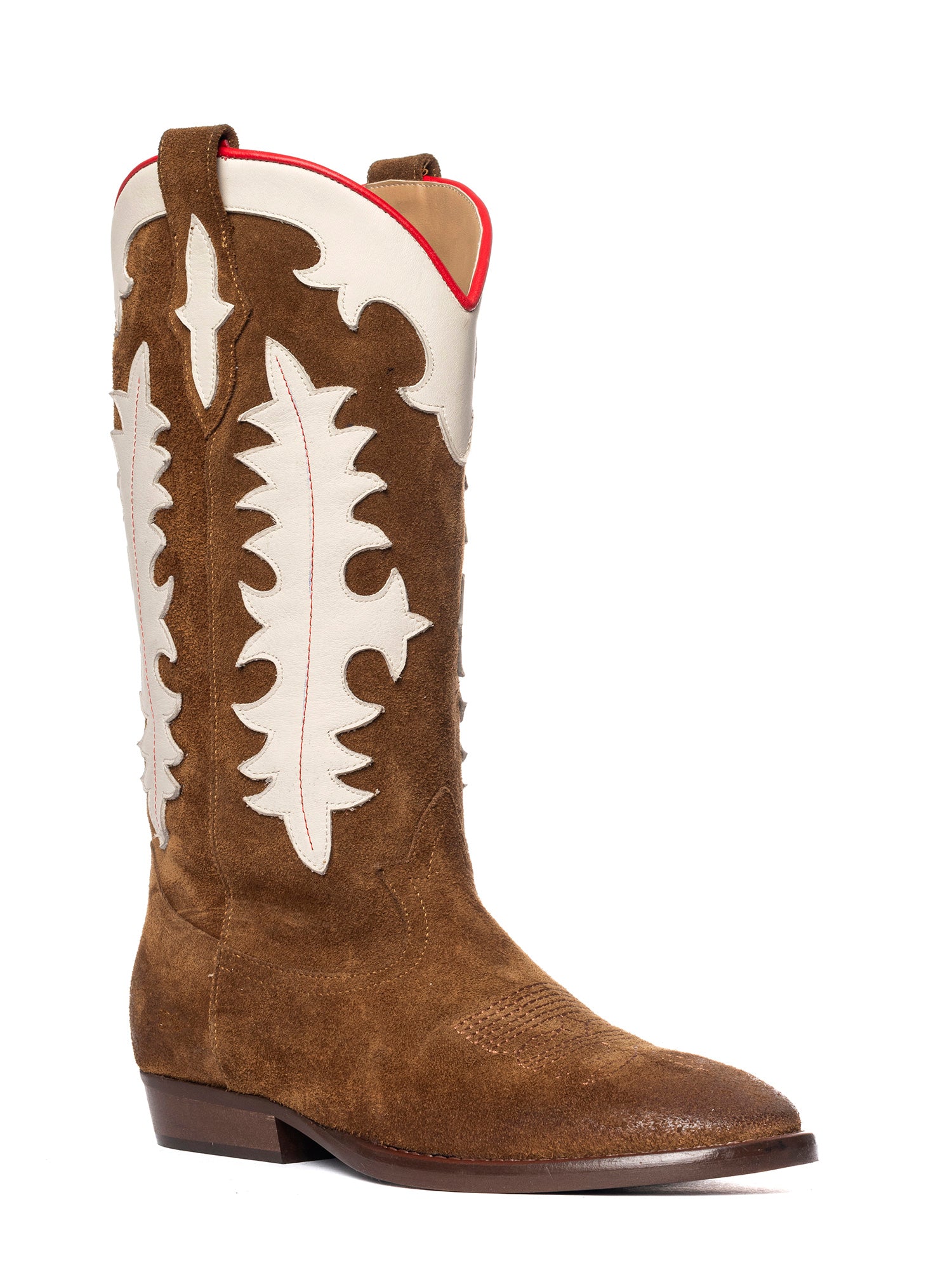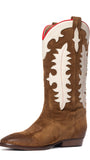 Stivali texani in camoscio bruciato con decori in contrasto Codice: Kansas Categoria: texani Materiale: camoscio Colore: bruciato Suola: gomma Chiusura: tubo Altezza gambale: 35 cm Altezza tacco: 2 cm