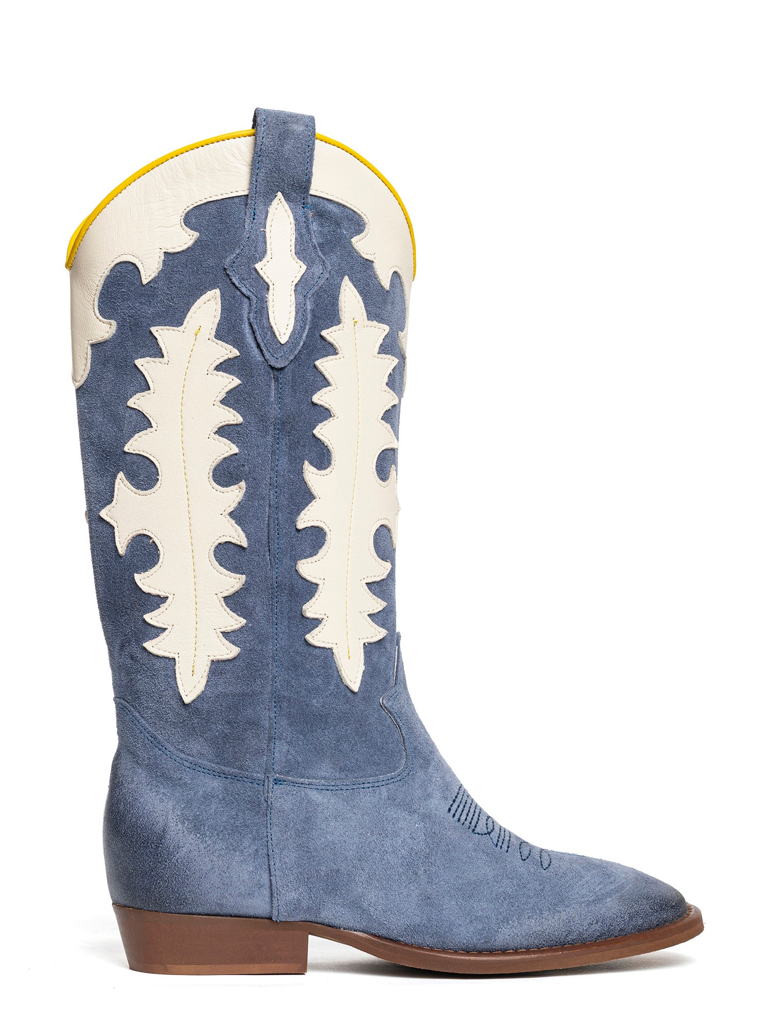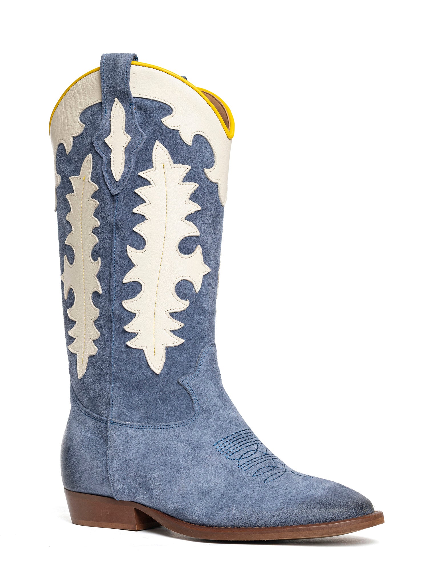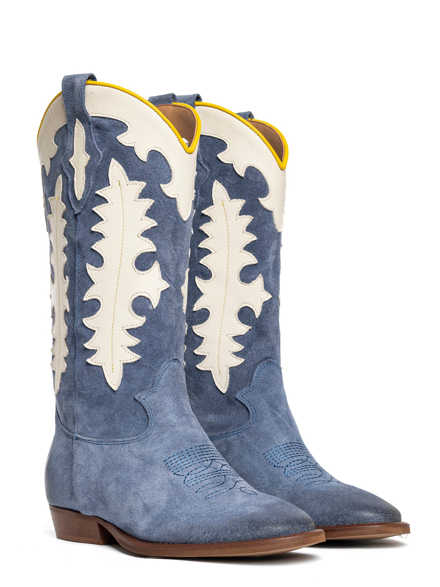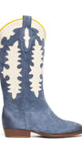 Stivali texani in camoscio calcite con decori in contrasto